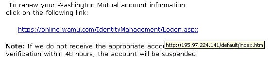 Another scary phish in my mailbox (my last was “Scary Chase Online Phish”). This one, targeting Washington Mutual (WaMu) customers showed up yesterday: