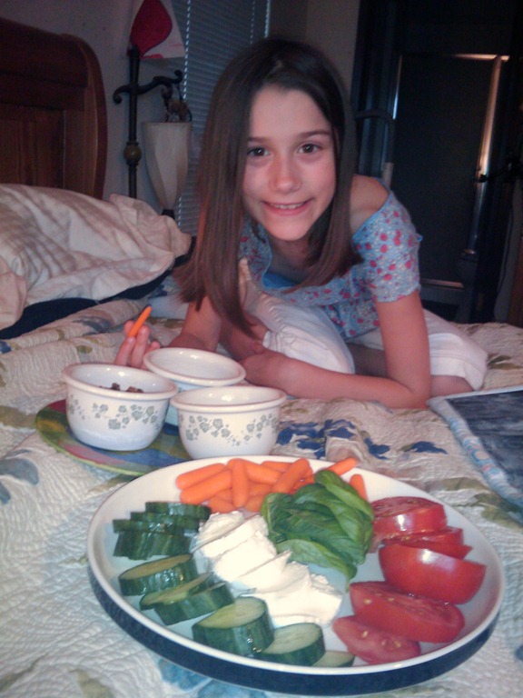 Tapenade, Hummus, basil, tomatoes, cucumbers, mozzarella, carrots and Ranch (she’s not too keen on Tapenade).